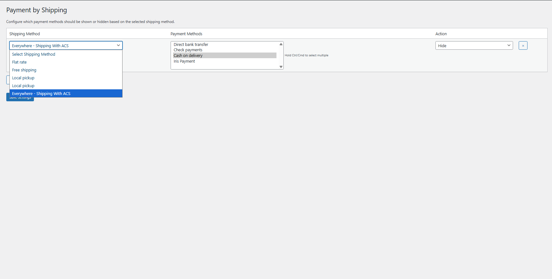 Ωστόσο, προτείνεται να αποφεύγεις αντικρουόμενους κανόνες και να χρησιμοποιείς είτε “Show” είτε “Hide” για κάθε shipping method ξεχωριστά.
