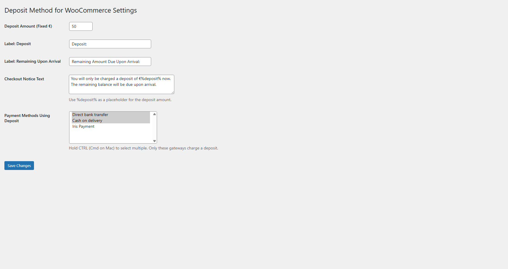 The current version uses a fixed deposit amount (e.g., €50) that applies to all orders using the selected payment gateways, regardless of cart contents. This simplified approach works well for businesses with consistent booking or reservation deposits. The remaining balance is automatically calculated by subtracting the deposit from the cart total (including fees, taxes, and discounts).